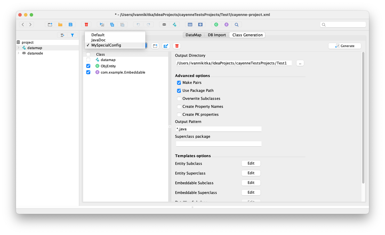We can now store multiple configurations to generate classes. **How this works:** 1. You can add/rename/delete configurations in the class generation panel for the selected data map (select the data map in the left panel, see fig.1). 2. You can start the class generation with the selected configuration in this panel. Other configurations will not be used. 3. In case you need to generate classes for all your datamaps and configurations, you can do it in the project level class generation panel (select the project in the left panel, see fig.2). All configurations will be used for the selected datamaps. 4. Multiple configurations are also available when using Maven/Ant/Gdradle plugins. 5. If you do not need to use multiple configurations, then no extra steps are required. Default configuration will be used for classes generation. _Fig. 1_ <img width="1348" alt="Screenshot 2022-11-23 at 09 50 56" src="https://user-images.githubusercontent.com/70625960/203519762-582d4885-9302-4367-a1ff-f3a630d0c357.png"> _Fig. 2_  _Fig. 3_ <img width="1348" alt="Screenshot 2022-11-23 at 10 59 09" src="https://user-images.githubusercontent.com/70625960/203519965-8d99957d-123f-4351-8e88-268ee3ff700c.png"> -- This is an automated message from the Apache Git Service. To respond to the message, please log on to GitHub and use the URL above to go to the specific comment. To unsubscribe, e-mail: [email protected] For queries about this service, please contact Infrastructure at: [email protected]