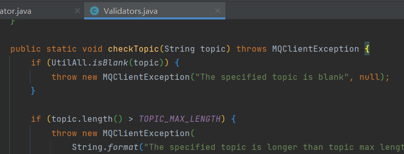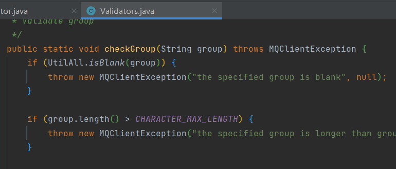 Remove repeated empty string checks for `topic` and `group`, and add unit tests. org.apache.rocketmq.client.Validators#checkTopic:  org.apache.rocketmq.client.Validators#checkGroup:  -- This is an automated message from the Apache Git Service. To respond to the message, please log on to GitHub and use the URL above to go to the specific comment. To unsubscribe, e-mail: [email protected] For queries about this service, please contact Infrastructure at: [email protected]