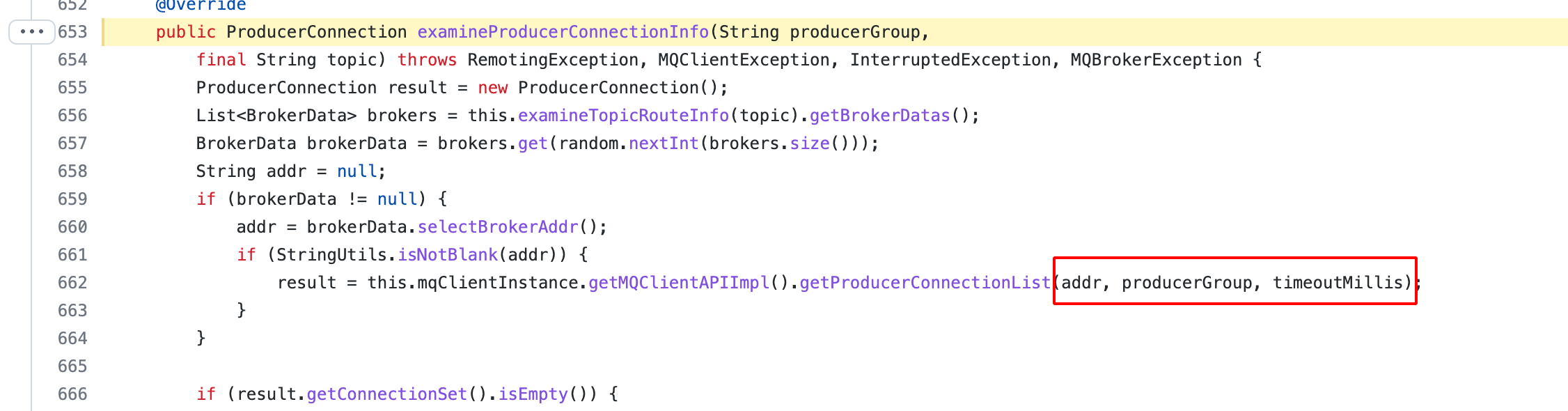 https://github.com/apache/rocketmq/blob/0f878b515703e160b3ef095059ffb6f90a7f7f4a/tools/src/main/java/org/apache/rocketmq/tools/admin/DefaultMQAdminExtImpl.java#L653  我在查看源码的时候,发现在调用getProducerConnectionList这个函数的时候,并没有传入topic,怀疑在获取生产者列表的时候并没有限制到具体的topic -- This is an automated message from the Apache Git Service. To respond to the message, please log on to GitHub and use the URL above to go to the specific comment. To unsubscribe, e-mail: [email protected] For queries about this service, please contact Infrastructure at: [email protected]