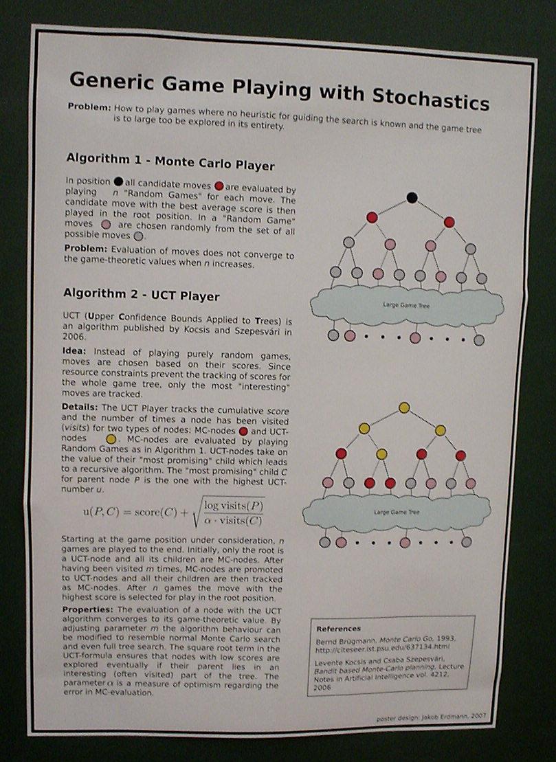 One of the visitors was Dr. Bernd Bruegmann (professor for gravitational theory in theoretical physics), who had been the first to apply Monte Carlo search in computer go back in 1993. Here is a photo from the event, showing him. http://www.althofer.de/bremer-walter-bruegmann.jpg Bernd Bruegmann is on the right, just talking with Lars Bremer (with the red card, journalist from c't magazine and computer games afficionado). In the background Rico Walter (Ph.D. student in discrete optimization) is listening. Ingo. >From the very same event is this poster on MC and UCT, designed by Jakob Erdmann: http://www.althofer.de/poster--monte-carlo.jpg -- GMX startet ShortView.de. Hier findest Du Leute mit Deinen Interessen! Jetzt dabei sein: http://www.shortview.de/[EMAIL PROTECTED] _______________________________________________ computer-go mailing list computer-go@computer-go.org http://www.computer-go.org/mailman/listinfo/computer-go/