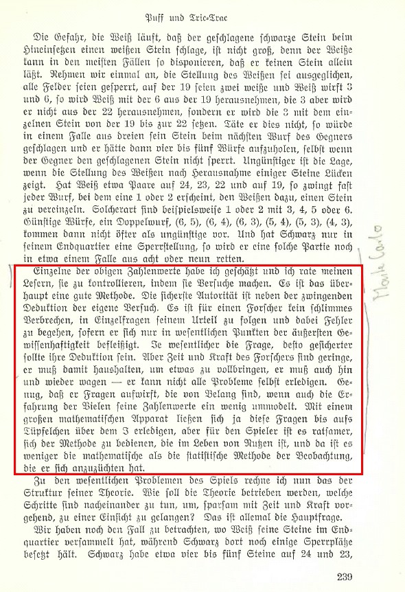 A scan of the original page 239 is online at http://www.althofer.de/lasker-monte-carlo.jpg *********** original text in German ***** Einzelne der obigen Zahlenwerte habe ich geschätzt und ich rate meinen Lesern, sie zu kontrollieren, indem sie Versuche machen. Es ist das überhaupt eine gute Methode. ... ... Mit einem grosssen mathematischen Apparat liessen sich ja diese Fragen bis aufs Tüpfelchen über dem I erledigen, aber für den Spieler ist es ratsamer, sich der Methode zu bedienen, die im Leben von Nutzen ist, und da ist es weniger die mathematische als die statistische Methode der Beobachtung, die er sich anzuzüchten hat. *************************************** Translation to English by Ingo Althoefer. From Emanuel Lasker: Board Games of the Nations, 1931. Chapter "Puff und Tric-Trac (Gammon variants)", middle of p.239; Some of the numerical values above are estimates by me. And my proposal for the readers is to control them by making "trials" [I avoid the term "simulations" instead of "trials", I.A.]. It [="making trials", I.A.] is in general a good method. ... ... By a large mathematical machinery these questions might be answered to the very detail. But for the player it is more advisable to use "the" method that helps in real life. And this method is not the mathematical one but the one with statistical observations which he should acquire. ********************************** Reading this, one has to keep in mind that of course there were no computers around in 1931, and that the name "Monte Carlo method" had not been coined. Does someine here know of even older proposals of Monte-Carlo for games? Ingo. _______________________________________________ Computer-go mailing list [email protected] http://dvandva.org/cgi-bin/mailman/listinfo/computer-go