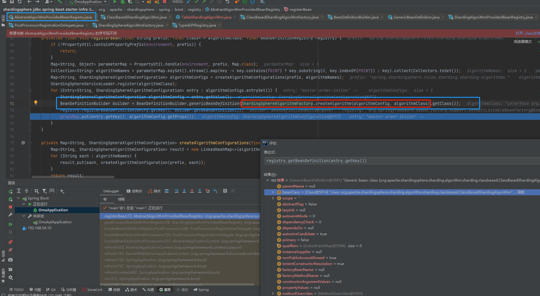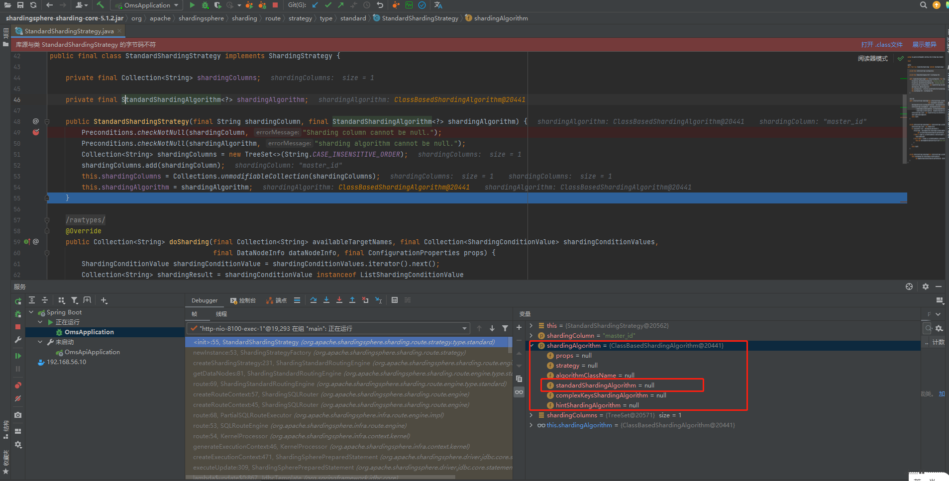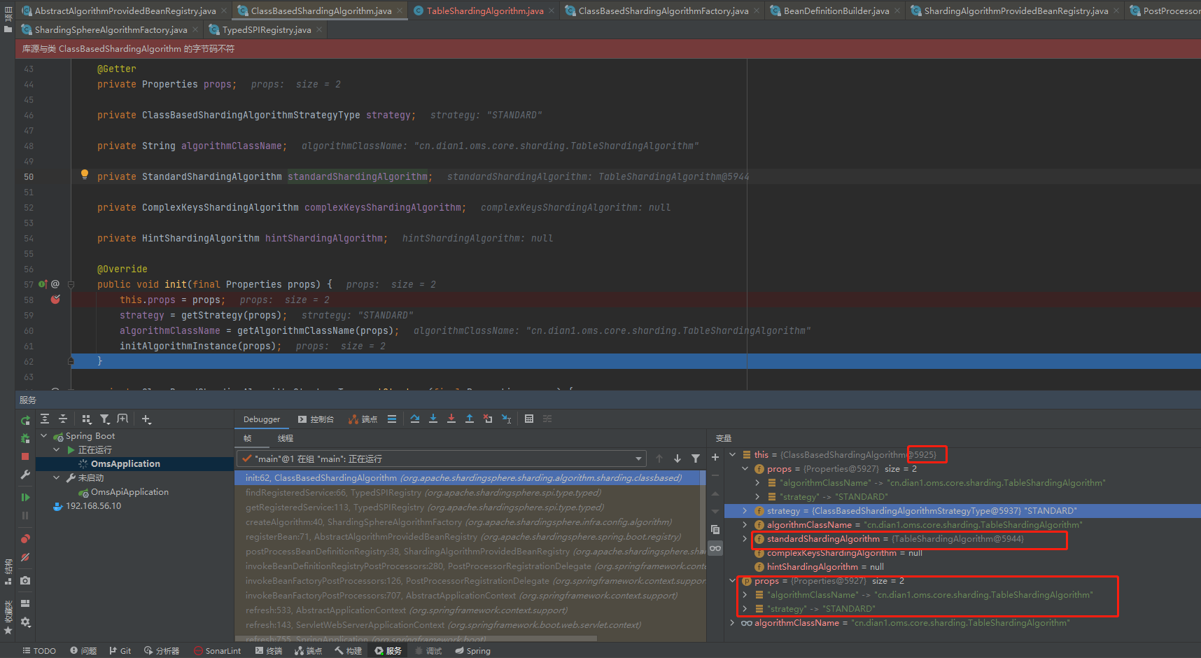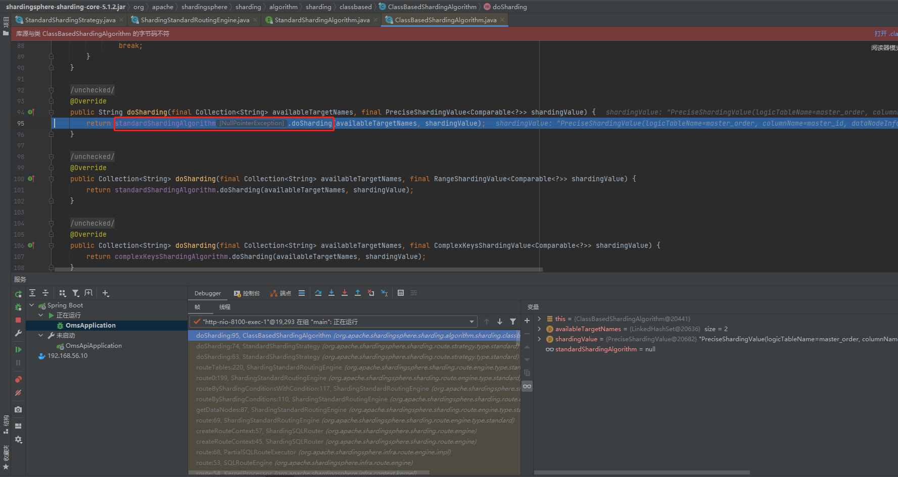I now switch to version 5.1.2, The classbasedshardingalgorithm object is @5925,All properties in it have been loaded successfully,The init () method also executes smoothly. TableShardingAlgorithm@5944.  Then I try to understand where this class is injected  After successful startup. I try to partition with custom partition。 Found in partialsqlouteexecutor#routes  Finally, when the standardshardingstrategy is initialized, there is a classbasedshardingalgorithm object in it. But not the same one, Above is classbasedshardingalgorithm @5925 Now it's classbasedshardingalgorithm @20441  Finally, in classbasedshardingalgorithm#dosharding java.lang.NullPointerException: null  -- This is an automated message from the Apache Git Service. To respond to the message, please log on to GitHub and use the URL above to go to the specific comment. To unsubscribe, e-mail: [email protected] For queries about this service, please contact Infrastructure at: [email protected]