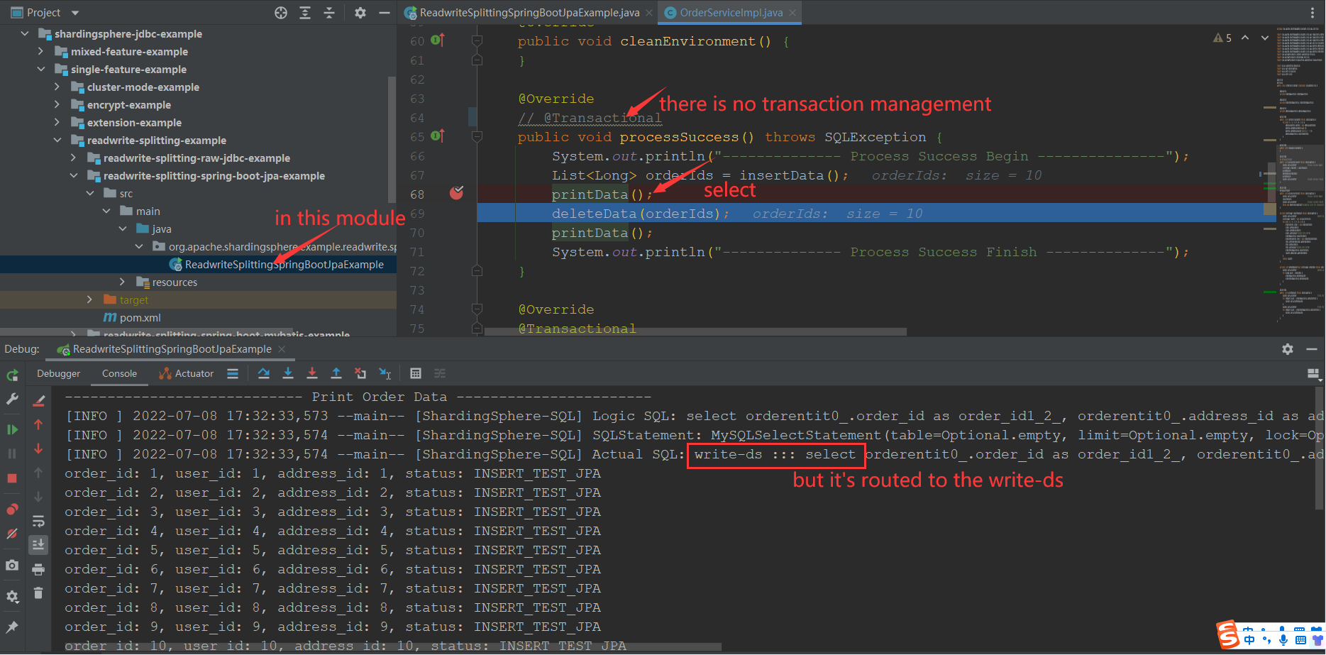## Bug Report **For English only**, other languages will not accept. Before report a bug, make sure you have: - Searched open and closed [GitHub issues](https://github.com/apache/shardingsphere/issues). - Read documentation: [ShardingSphere Doc](https://shardingsphere.apache.org/document/current/en/overview). Please pay attention on issues you submitted, because we maybe need more details. If no response anymore and we cannot reproduce it on current information, we will **close it**. Please answer these questions before submitting your issue. Thanks! ### Which version of ShardingSphere did you use? v5.1.2 ### Which project did you use? ShardingSphere-JDBC or ShardingSphere-Proxy? ShardingSphere-JDBC ### Expected behavior When using JPA, and in the absence of transaction management, the select is routed to the write-ds, why not the read-ds? ### Actual behavior  ### Reason analyze (If you can) ### Steps to reproduce the behavior, such as: SQL to execute, sharding rule configuration, when exception occur etc. ### Example codes for reproduce this issue (such as a github link). -- This is an automated message from the Apache Git Service. To respond to the message, please log on to GitHub and use the URL above to go to the specific comment. To unsubscribe, e-mail: [email protected] For queries about this service, please contact Infrastructure at: [email protected]