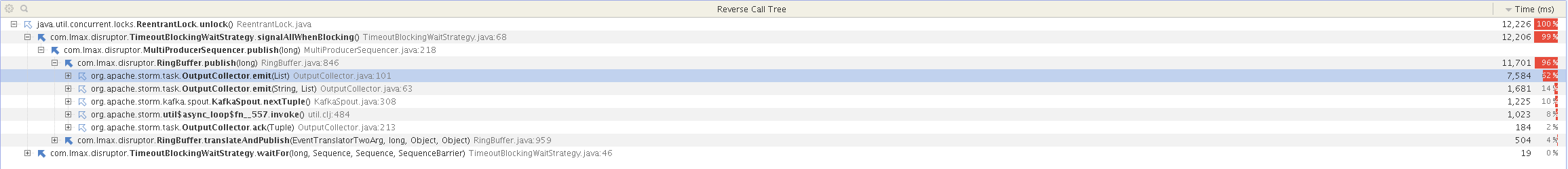 Hi, TimeoutBlockingWaitStrategy.signalAllWhenBlocking is taking high CPU for the topology we have. PFA the yourkit profiling snapshot.